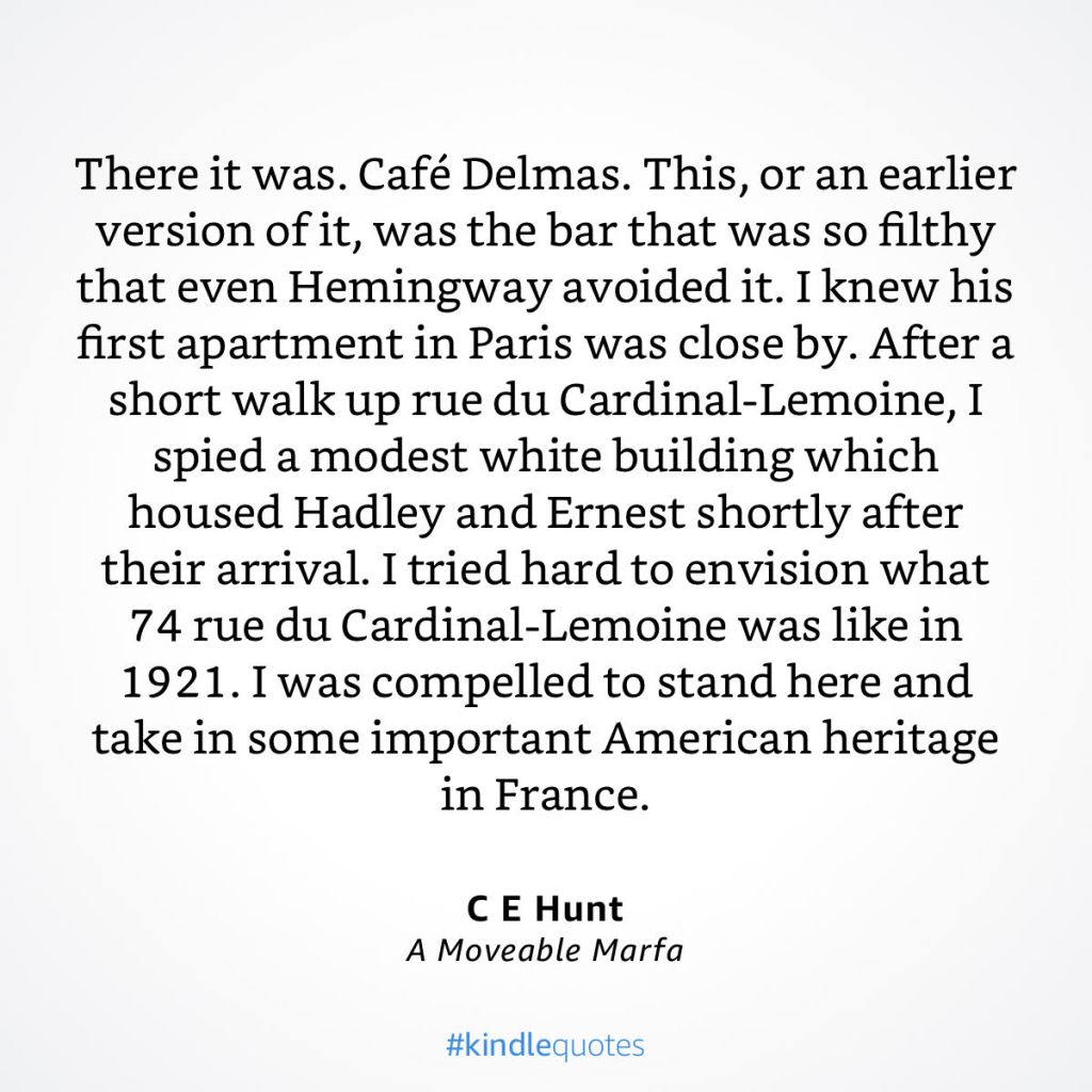 I worked on A Moveable Marfa during the years I lived Paris, 2010-2013. I knew additional books might also emerge from this experience. Which is now happening. The Sommières Sun, my next novel and a sequel to A Moveable Marfa is in the final stages of pre-publication editing. In telling of my story of protagonist, Steve Miles, both novels feature content on Hemingway’s life in Paris and his philosophy on writing.